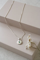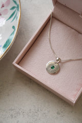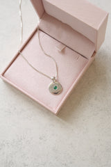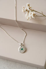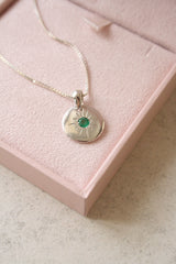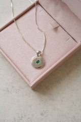 שרשרת כסף 925 מהממת שיש בה שילוב של עדינות, משמעות, ונוכחות עם תליון עגול בעבודת יד, משובץ באבן ברקת (אמרלד) ירוקה ומרהיבה.