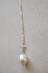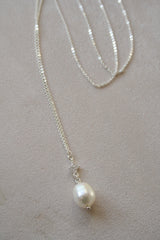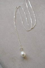 שרשרת כסף עדינה וארוכה עם תליון פרח משובץ זירוקנים שקופים ופנינה טבעית ממים מתוקים.