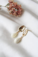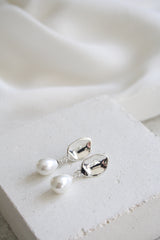 העגילים נופלים וצמודים לאוזן, עשויים אליפסה מרוקעת מכסף 925 ופנינת מיורקה בצבע שמנת וגימור מט