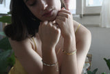 צמיד מגניב באווירת בוהו שיק עשוי חרוזי צינור לבנים מאבן טבעית וחרוזי המטייט קטנים משולבים בין לבין. בסוף הצמיד תוספת של שרשרת גולדפילד ופנינה טבעית נופלת בקצה.