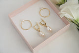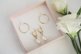 עגילי טיפת פנינה נופלת, קלאסים ויפים עשויים מתלה מוזהב ופנינה לבנה טבעית ולצידם זוג עגילי חישוק מגניבים וצמודים לאוזן בעיצוב מודרני עם פנינים לבנות קטנות שמוסיפות את הטאצ׳ הקלאסי והרך שיש בפנינים.