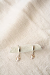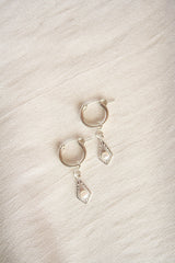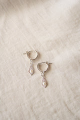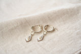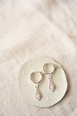 העגילים עשויים חישוקי כסף קטנים עם סגירת מנוף בטיחותית וקלה לענידה, תליוני מעויין מעוטרים ופנינה במרכז.