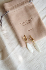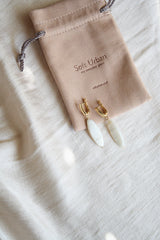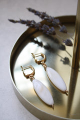 עגילים ארוכים ואלגנטים עשויים צדף אם הפנינה לבן בצורת מרקיזה ומתלי זהב בולטים ומרשימים.