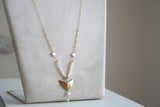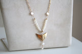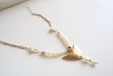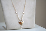 התליון של השרשרת דמוי סנפיר מצופה זהב 14 קראט עמיד ואיכותי ופנינים טבעיות מתורבתות מושחלות על שרשרת גולדפילד ארוכה.