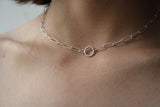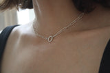 שרשרת כסף מגניבה בעיצוב מנימליסטי ועכשווי עשויה חוליות מלבן עם טקסטורה נוצצת ועדינה וחישוק עם טקסטורת חבל במרכז