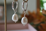 עגילי פנינים מגניבים שעושים הרבה שואו בכל אאוטפיט. העגילים עשויים חישוקי כסף ופנינים טבעיות, לבנות ונופלות. עיצוב שמשלב בין הקלאסי לעכשווי עם טוויסט מגניב לפנינים האהובות